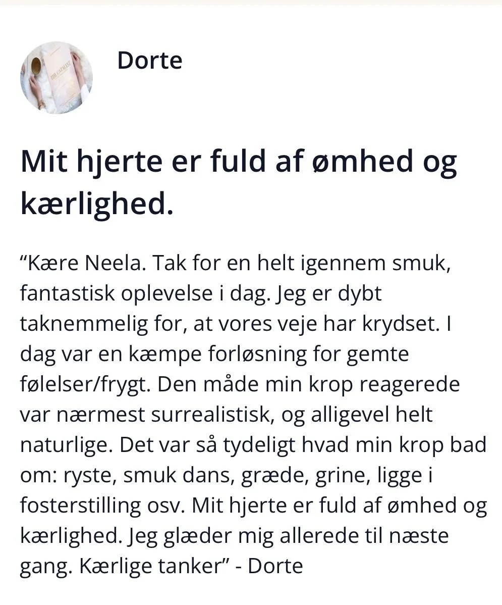 “Kære Neela. Tusind tak for en helt igennem alt for vild oplevelse. Det var meget følelsesladet og befriende samtidig. Den varme der gik igennem min krop, da vi fik forløst alle mine følelser og traumer, var simpelthen den vildeste oplevelse. Kan ikke beskrive det med ord jeg har det så godt i dag og jeg elsker det. Hvis i virkelig ønsker at få bugt med jeres inderste så book en tid hos Neela, det er absolut det hele værd. Hun er det skønneste menneske, varm, har så meget kærlighed og støtter dig igennem det hele. Tusind tak for muligheden for at komme tilbage til livet. Af hjertet tak.” - Annie